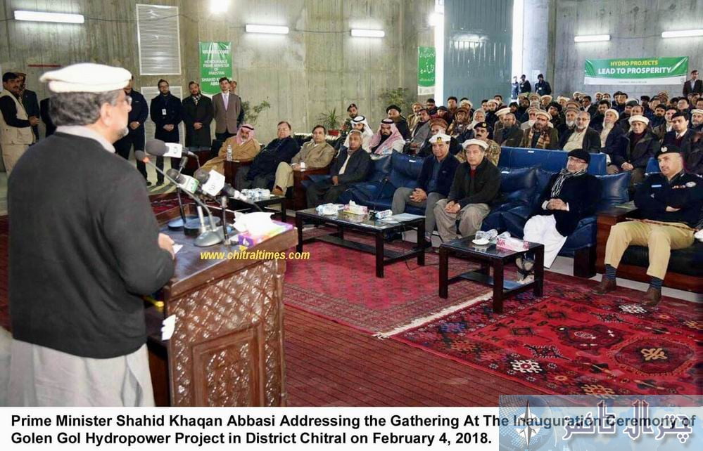 Prime Minister Shahid Khaqan Abbasi Addressing the Gathering At The Inauguration Ceremony of Golen Gol Hydropower Project in District Chitral on February 4, 2018.